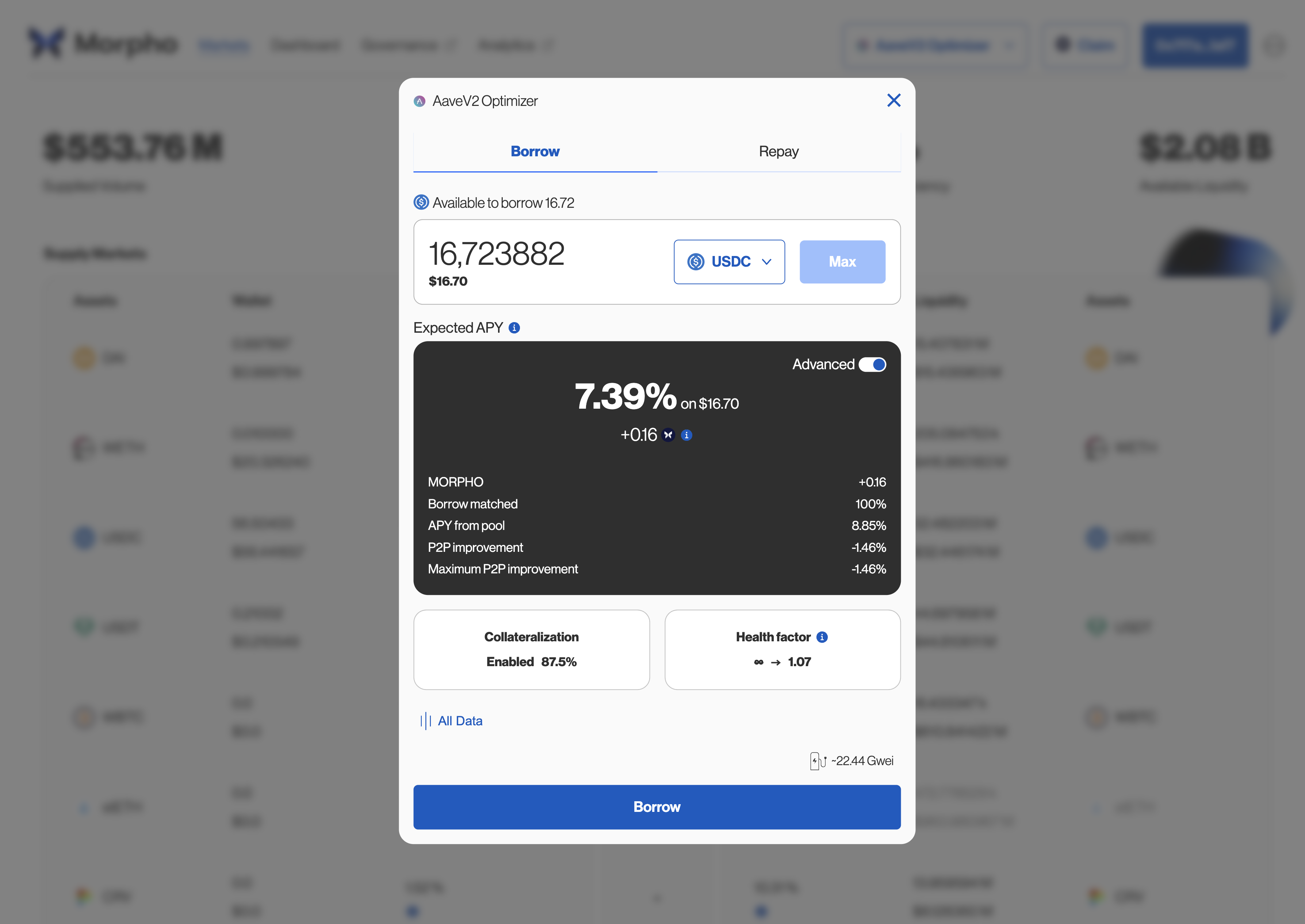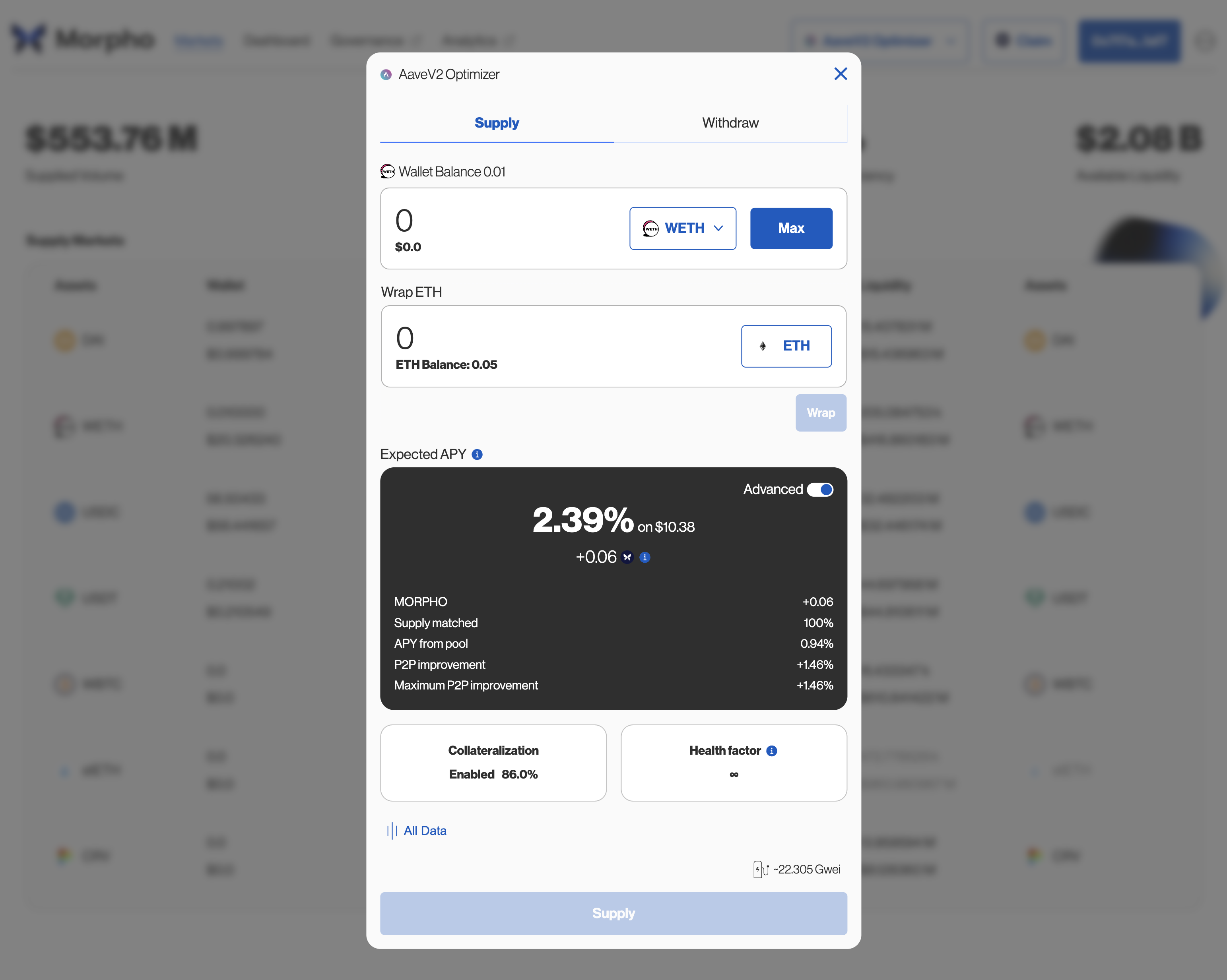 - Once the transaction is finalized, click on Supply. Don't forget to check the available information, such as the pool and P2P APY, and your borrowing capacity!