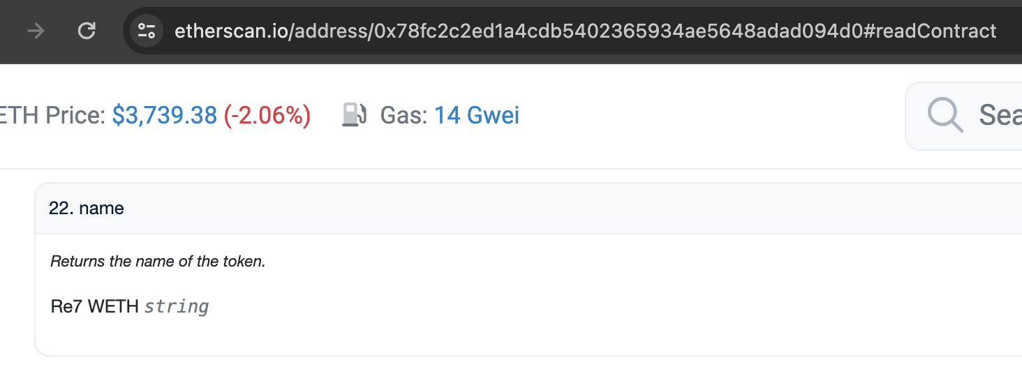 Let's take into account the Re7WETH vault on Ethereum Mainnet, deployed at address: 0x78Fc2c2eD1A4cDb5402365934aE5648aDAd094d0.
