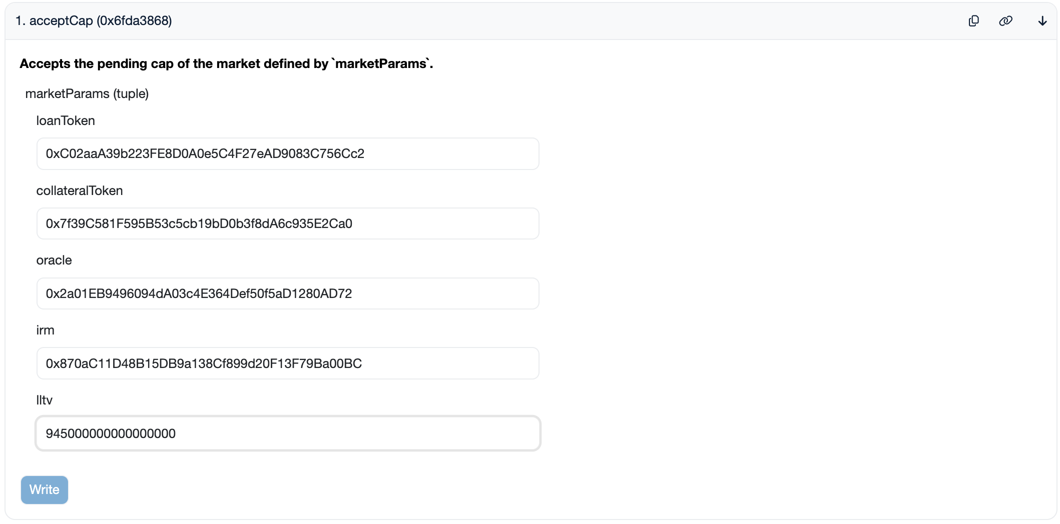 Execute the acceptCap() with the market parameters of the market, which in this case are retrievable thanks to the idof the market: 0xc54d7acf14de29e0e5527cabd7a576506870346a78a11a6762e2cca66322ec41