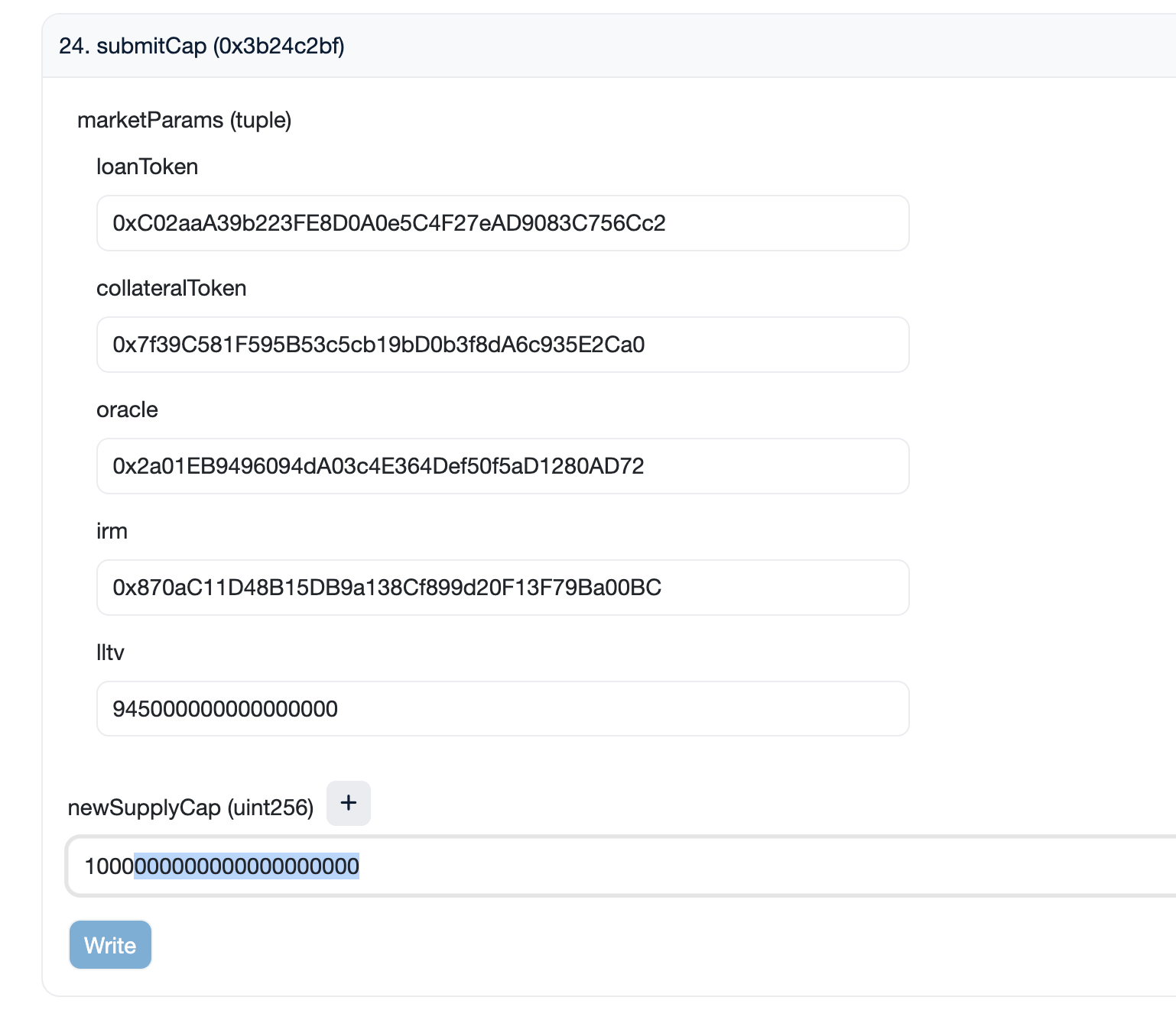 submitCapas in the picture below. Keep in mind that tenewSupplyCapis in decimals of the asset (loan token).