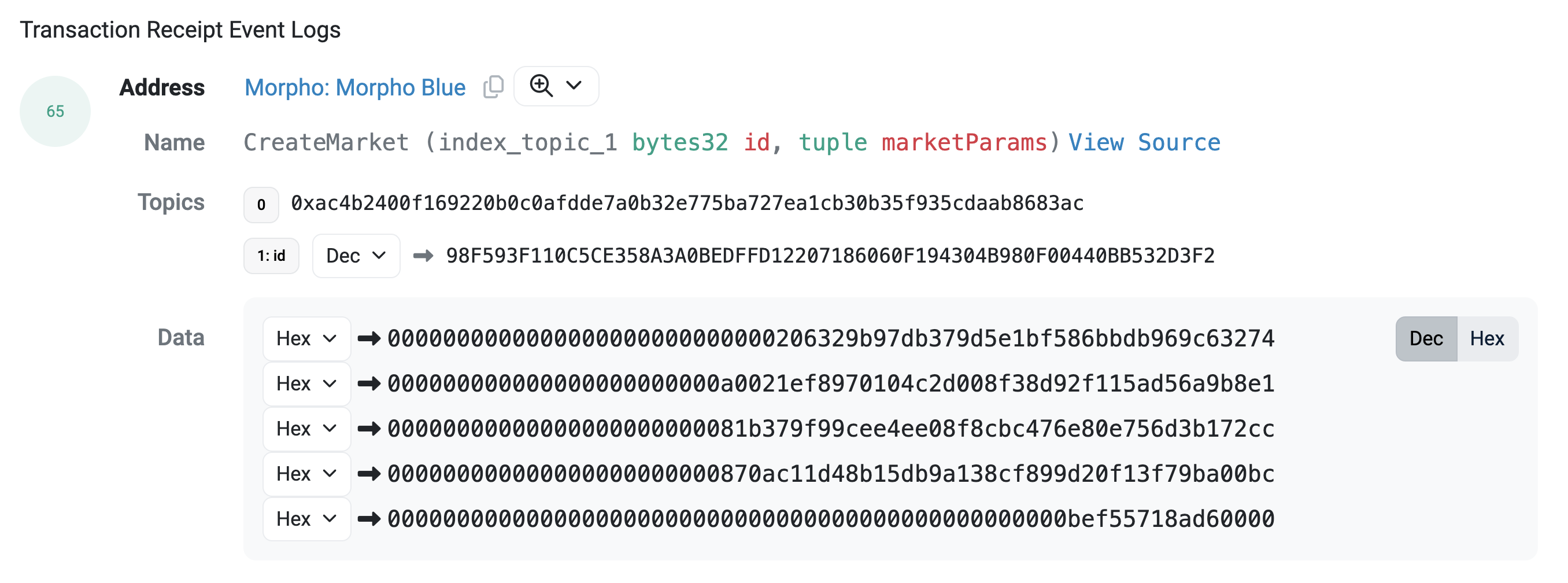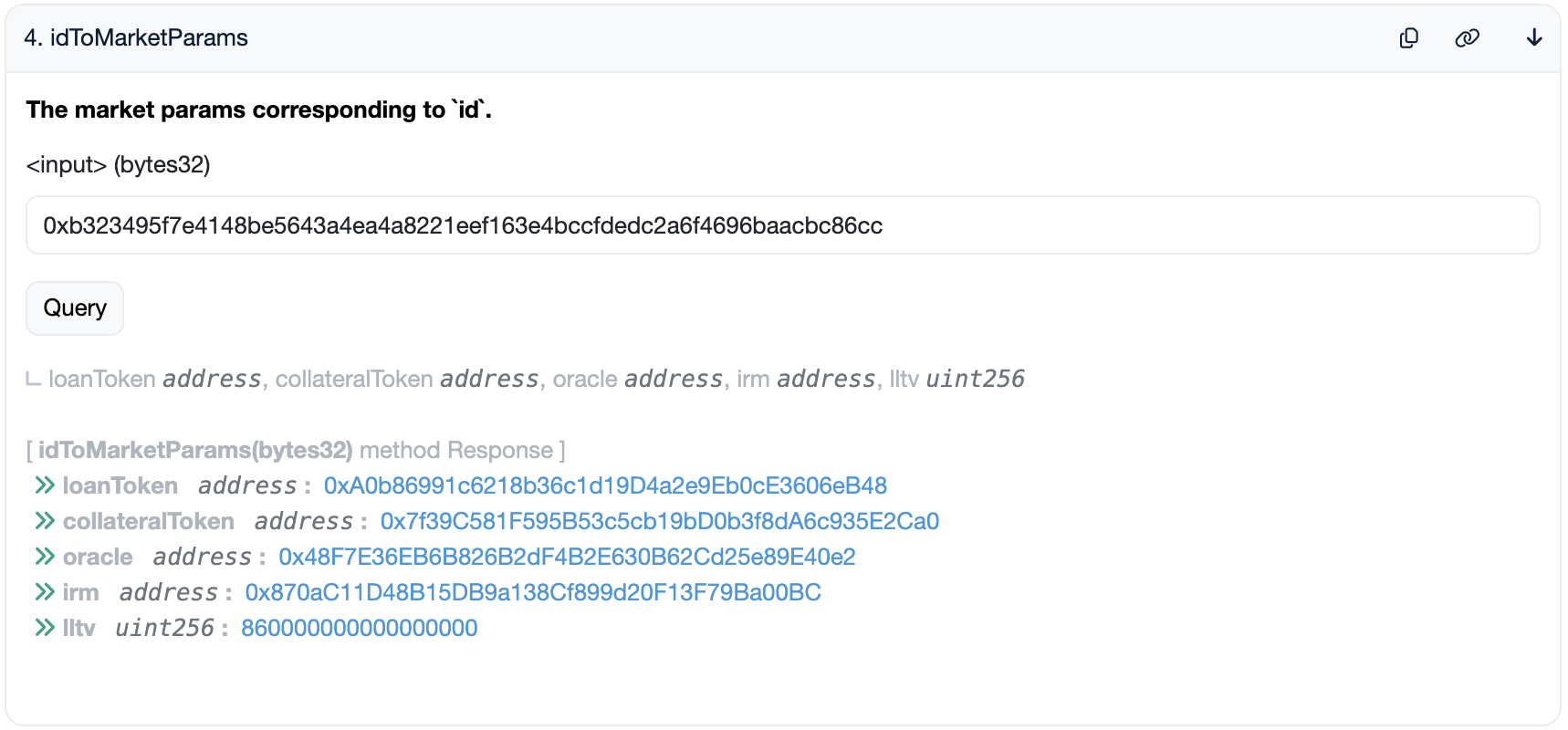 To retrieve the market parameters from this id, one has to paste the id into the idToMarketParams function on the Morpho contract.